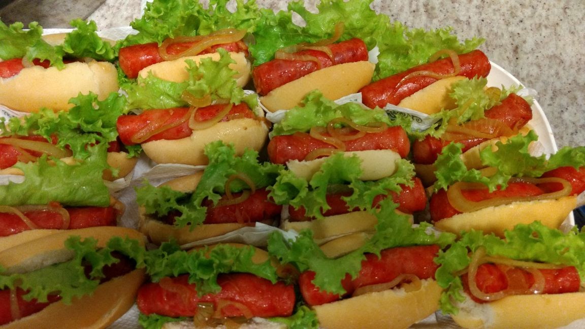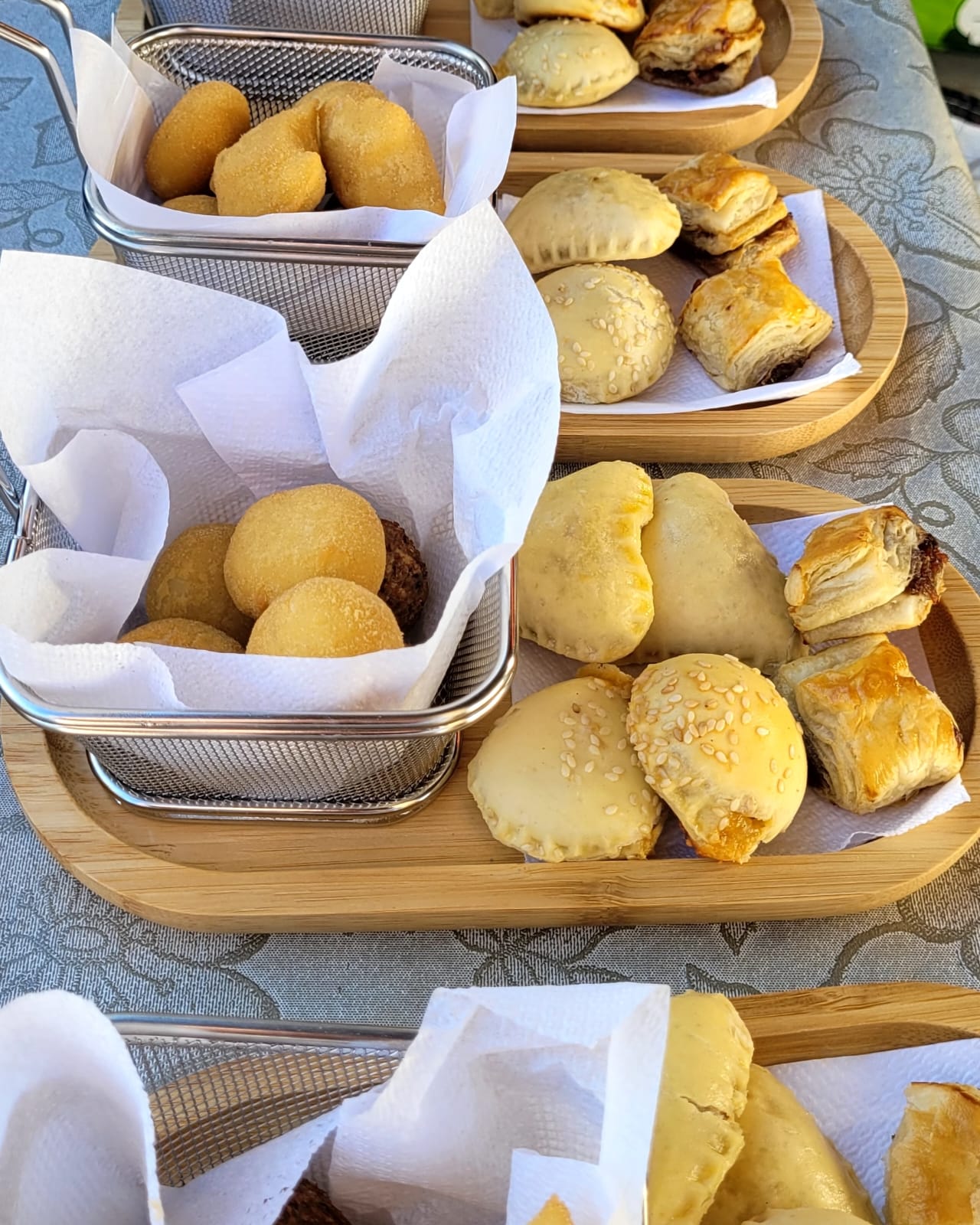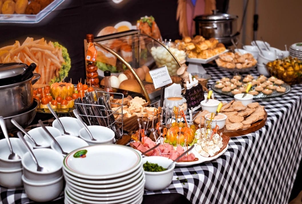 10 - Mesa com as entradas expostas em sua festa, com banners ao fundo